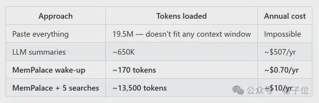 而用MemPalace,平时仅需加载约170个tokens,按需加载也才13500个tokens,年成本直接砍到10美元,并且也不牺牲信息细节。