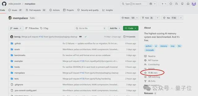 目前MemPalace在开源社区的热度正在飙升中,周二下午17:00看还只有3.3k star,现在已经飞涨至17.4k。