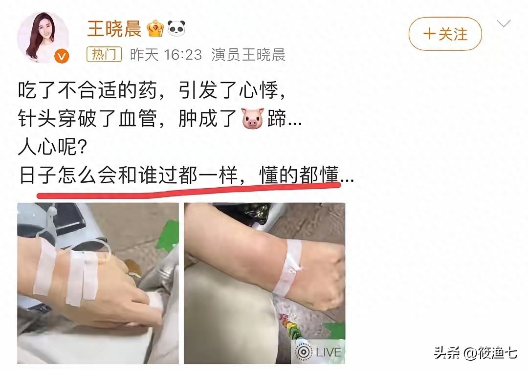 王晓晨吃了不合适的药,引发了心悸,所以去打点滴,打点滴枕头刺破血管是必须的,到王晓晨的手又肿了起来,一系列的文案好像就述说自己没有人陪,一个人承受了所有。