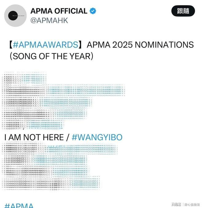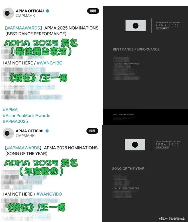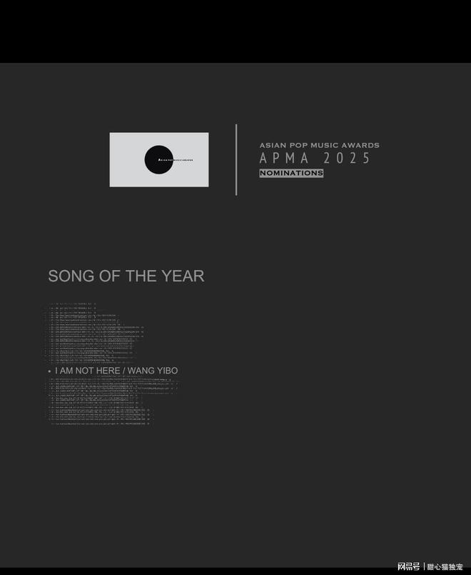 王一博的《我在》在APMA亚洲流行音乐大奖上简直太争气了,一口气揽下四项提名!最佳舞台表演、年度歌曲、最佳歌词、最佳作曲,这四个重磅奖项的提名资格,足以说明这首歌的分量有多重。