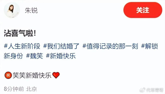 此次魏笑官宣结婚,圈内好友也纷纷送上祝福,朱锐等艺人留言感慨“要沾喜气”,网友们更是刷屏“新婚快乐”“百年好合”,祝福这对低调相恋多年的恋人,也为这份纯粹的闺蜜情感动。在娱乐圈中,有人追逐流量名利,有人坚守真心热爱,魏笑不仅收获了势均力敌的爱情,还有不离不弃的友情,无疑是人生赢家。