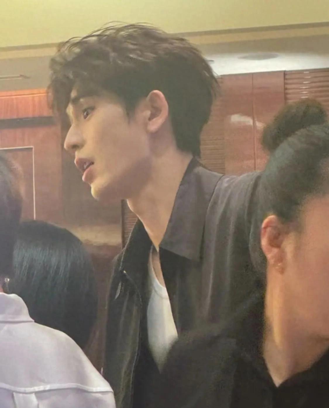 张凌赫从片场匆匆赶到庆功宴现场,他穿了一整套的Gucci,黑色夹克搭配黑色阔腿裤,内搭了一件白色T恤,他穿这身很帅气。张凌赫最近又瘦了,他的下颌线更明显了,喉结也更明显了,这个侧颜太迷人了。