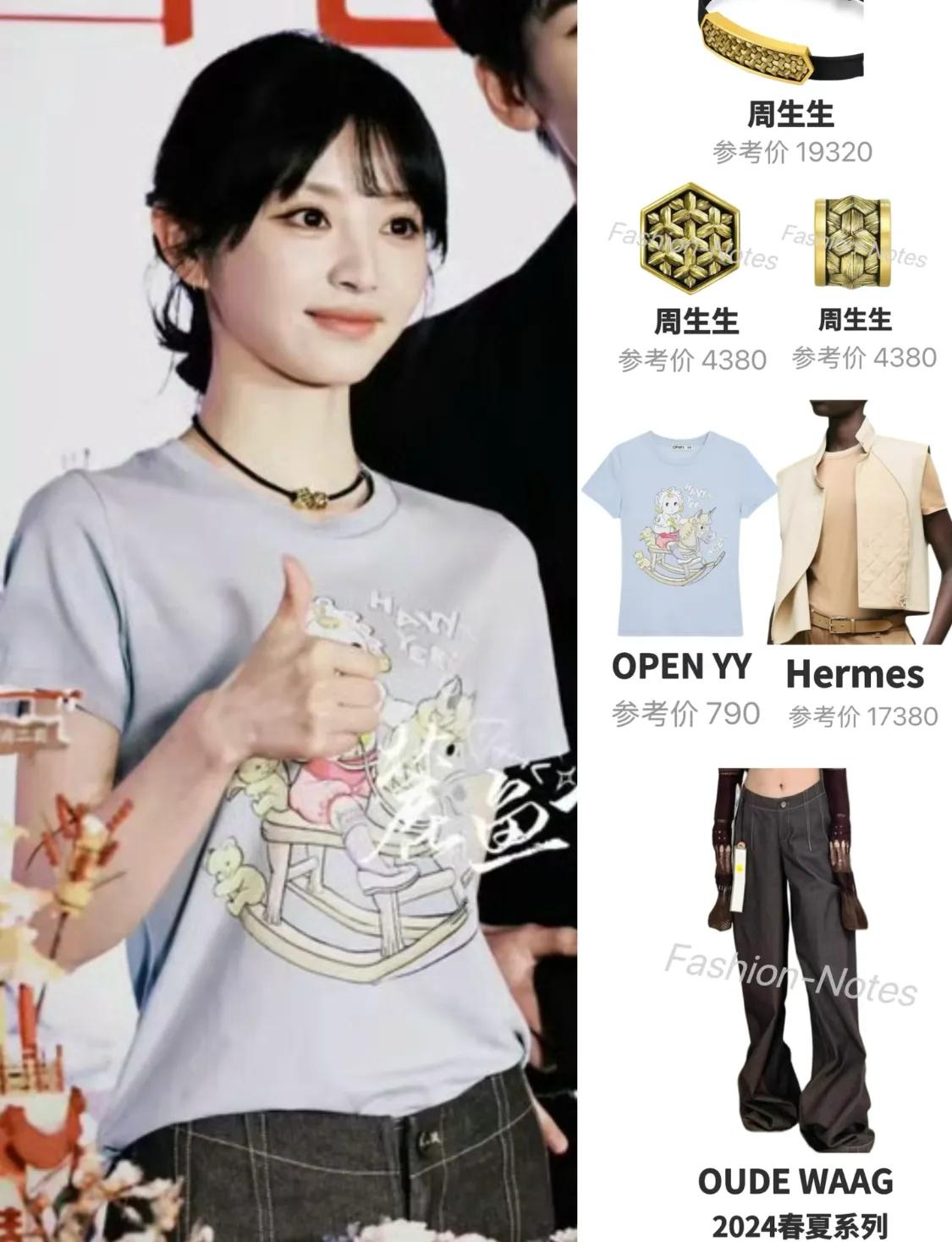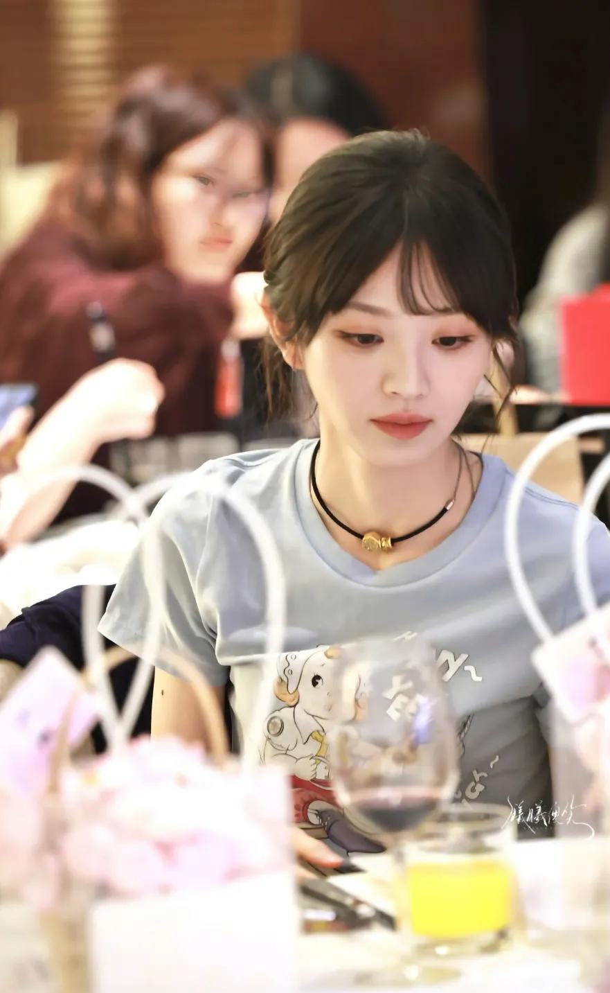 女主角田曦薇穿着蓝色百元T恤来参加庆功宴,她脖子上戴的周生生转运珠很好看,这件黄金首饰被她戴出圈了。