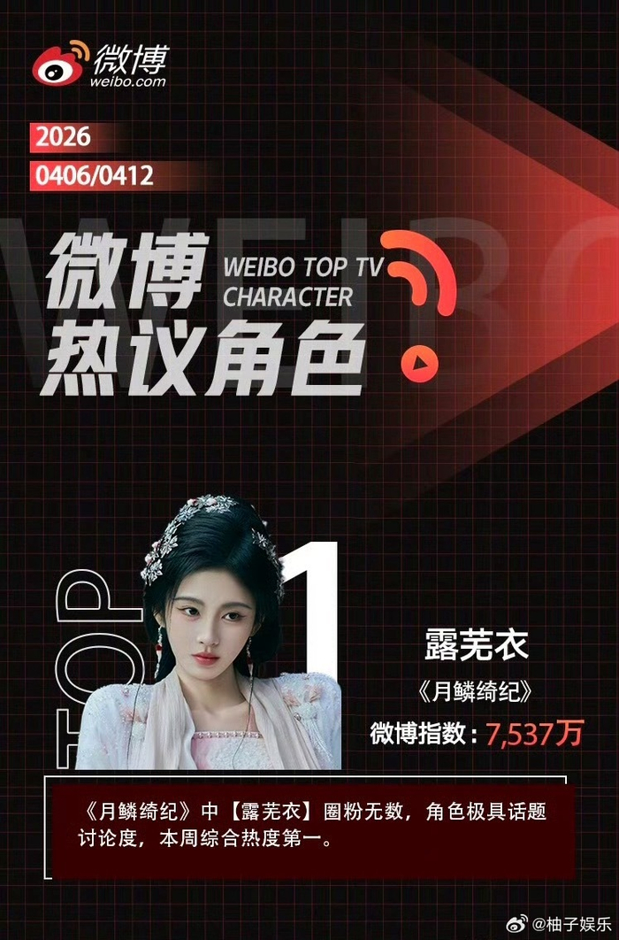微博热议角色上周榜单,鞠婧祎露芜衣微博指数7537万,依旧断层,拿下各项的第一,露芜衣好圈粉!
