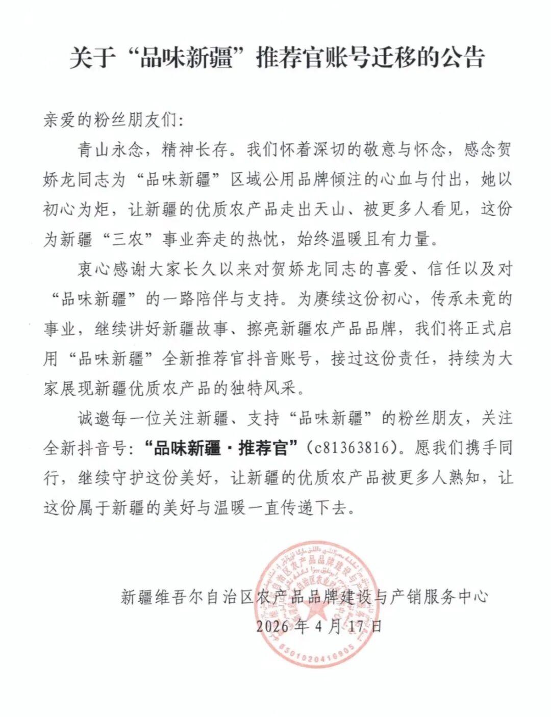 这条发布于一周前的视频,当时并未掀起太大波澜。直到4月19日,“贺娇龙 品味新疆”账号发布《关于“品味新疆”推荐官账号迁移的公告》,对贺娇龙账号及新开通账号的情况予以说明。这才让更多公众的目光投至“品味新疆·推荐官”账号和蔡宜芮本人。