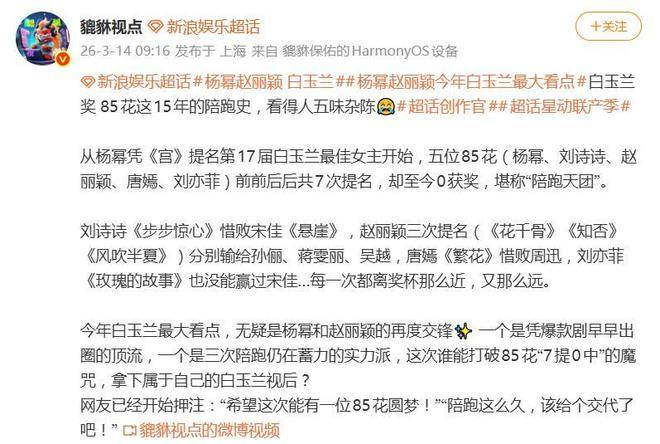 每一次提名都近在咫尺,却又屡屡失之交臂。正因如此,2026年的这场内斗被赋予前所未有的集体期待。网友评论中写道:希望这次能有一位85花圆梦!陪跑这么久,该给个交代了吧!由此可见,这场杨幂与赵丽颖的视后之战,早已超越个人荣誉,它是一场关于85花群体实力正名的集体突围,更是一场从流量偶像到演技派彻底转型的成果验收。无论最终奖杯花落谁家,这场对决本身,或许已成为打破魔咒的第一步。