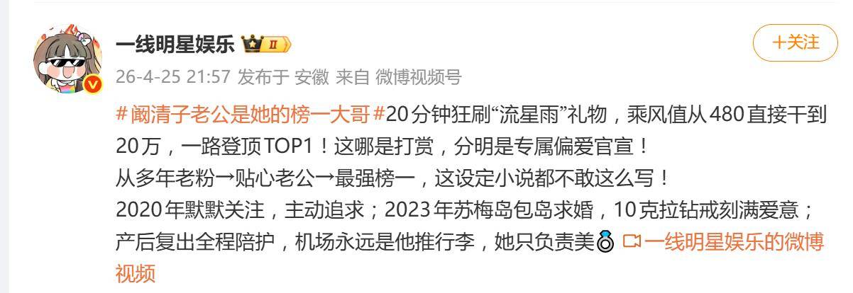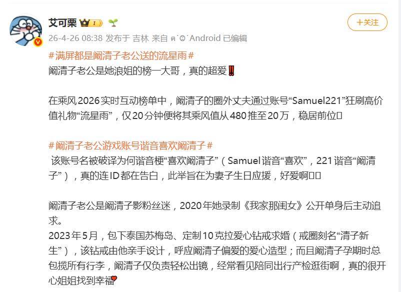 据网友4月26日爆料,《乘风2026》的直播夜,正当大家还在为姐姐们的舞台表现刷屏时,一场突如其来的“流星雨”直接让直播间特效炸裂——阚清子的丈夫周浩,以账号“Samuel221”的身份高调现身,在互动环节狂刷单价5200元的虚拟礼物“流星雨”,短短20分钟内,硬生生将阚清子的乘风值从几百名开外直接推到了20万的断层TOP1。