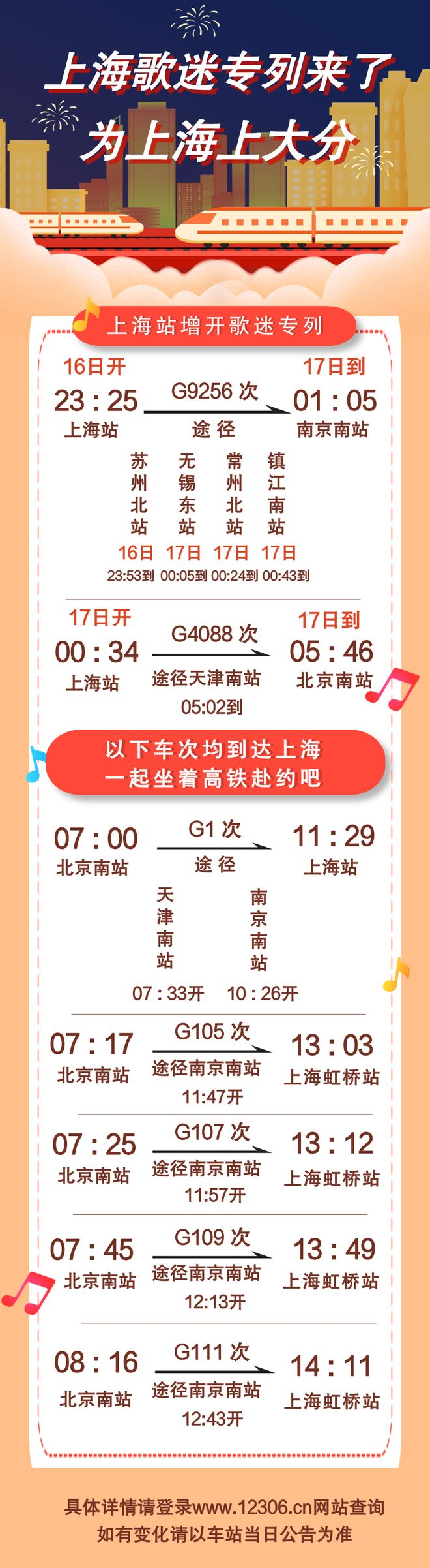 五月天上海演唱会增开2列:11月16日,将增开上海站至南京南站G9256次;11月17日,将增开上海站至北京南站G4088次。