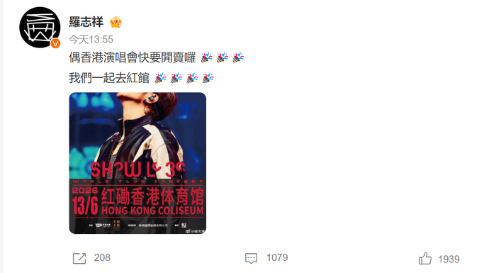 4月14日中午,罗志祥个人微博还更新了香港演唱会信息。