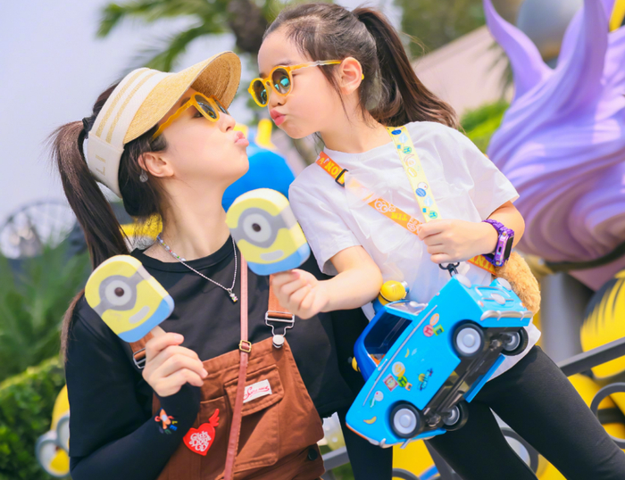 董璇与女儿小酒窝不仅在外在形象上给人的感觉像姐妹,两个人相处起来也是如此。董璇将小酒窝背在身上,母女俩手牵着手展出同款美丽笑容,这画面简直温馨有爱极了。