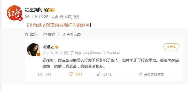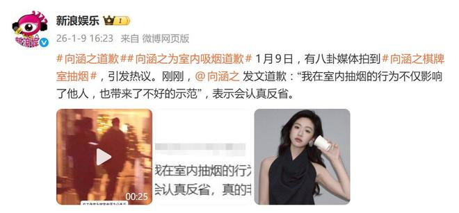 一石激起千层浪。1月9日,演员向涵之被八卦媒体拍到在棋牌室内吸烟的画面,相关话题迅速冲上热搜。就在舆论发酵的当天,向涵之本人在微博火速公开发文道歉,态度之快、措辞之直接,被不少网友调侃为“这届艺人的危机公关,反应速度是练过的”。