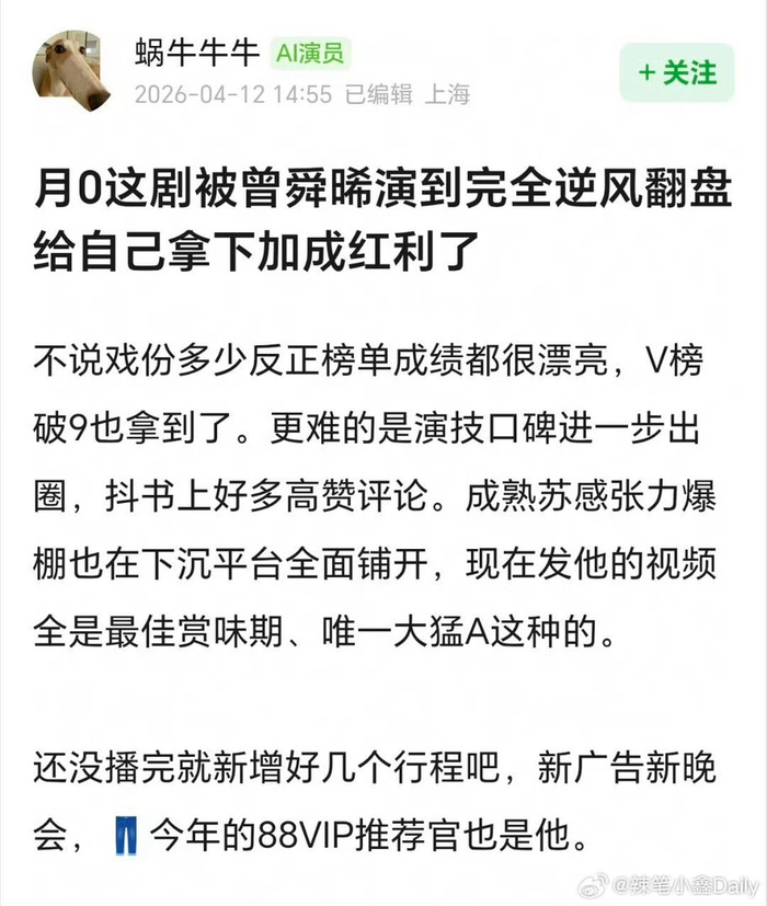 #曾舜晞完全逆风翻盘##曾舜晞给自己拿下加成红利# 真的被曾舜晞的敬业和实力打动!就算是小成本剧,也用百分百的演技演绎,硬生生逆风翻盘,拿下属于自己的加成红利!