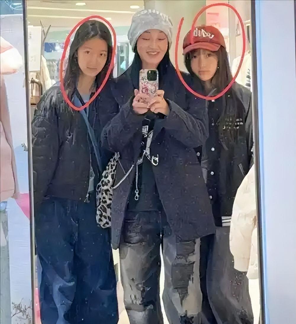 照片里的她扎着马尾,身着宽松西装,牵着两个女儿悠闲逛街。