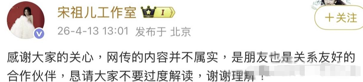 4月13日,宋祖儿刘宇宁”冲上热搜榜首的第一时间,宋祖儿工作室就火速发布声明:“网传的内容并不属实,是朋友也是关系友好的合作伙伴,恳请大家不要过度解读。”