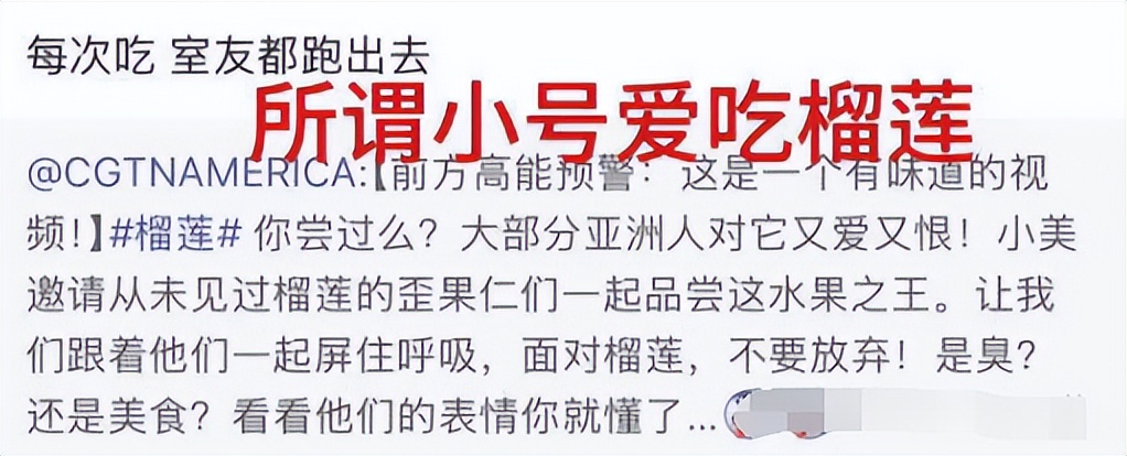 该小号还曾在评论里大赞“榴莲好吃”,而宋祖儿在多个采访中明确表示“最讨厌的水果3是榴莲”。