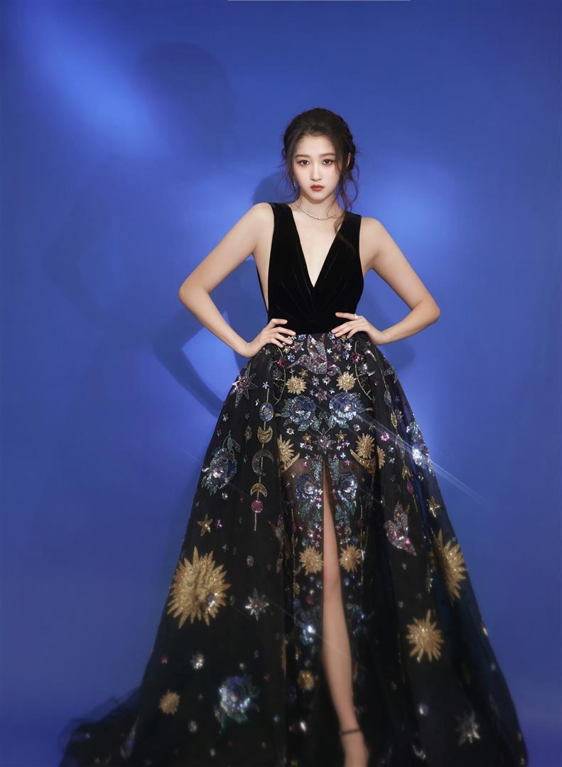 在光影交织的红毯上,关晓彤以一袭Maison Chahad定制星空黑裙惊艳亮相,仿佛将浩瀚宇宙披于一身。金箔绣制的太阳与银闪点缀的星月在黑色网纱裙摆上流转,走动间如星河倾泻,既浪漫又充满力量感。这件礼服不仅是视觉盛宴,更成为高个子女性礼服穿搭的典范之作。