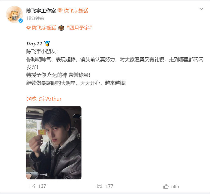 恭喜阿瑟获得由工作室颁发的“永远的神”奖状,真的太可爱啦!