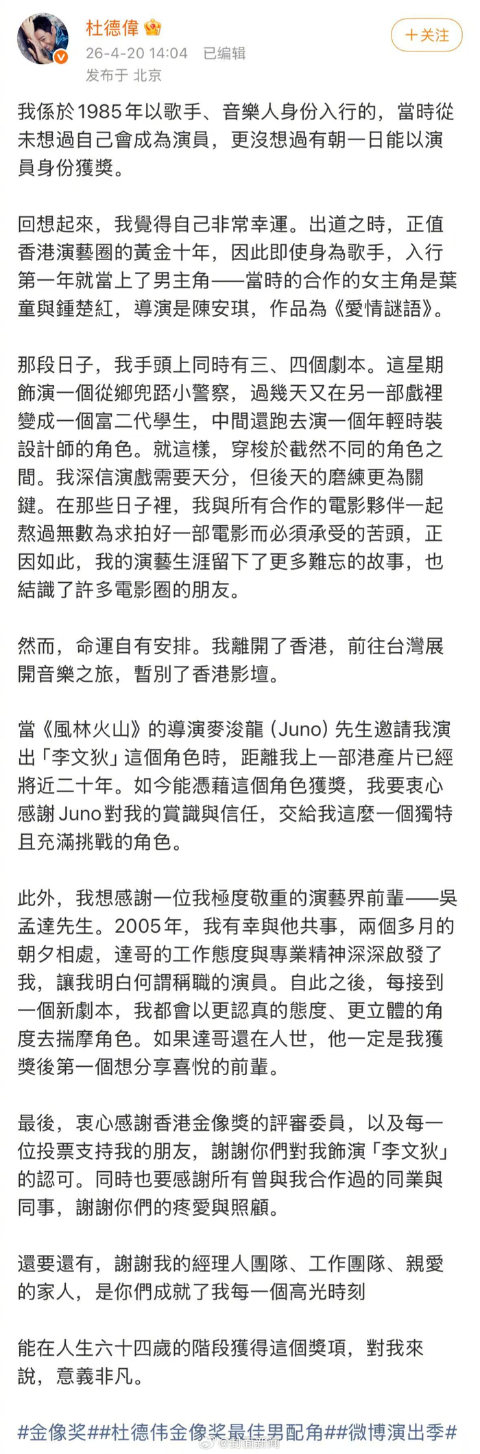【#杜德伟回应金像奖最佳男配角#】#杜德伟没想过会成为演员#4月20日,第44届香港电影金像奖最佳男配角@杜德偉 发文表示:我在 1985 年以歌手、音乐人的身份入行,当时从未想过自己会成为演员,更没想过有朝一日能以演员身份获奖。“能在人生六十四岁的阶段获得这个奖项,对我来说,意义非凡。”
