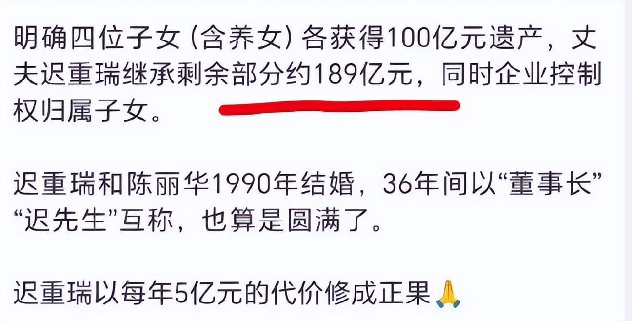 陈丽华女士离世之后,巨额遗产是如何分配的成大家最关心的话题。从网络上的报道来看,4个子女各继承了100亿,而迟重瑞拿到了189亿可以说是一夜登天了。