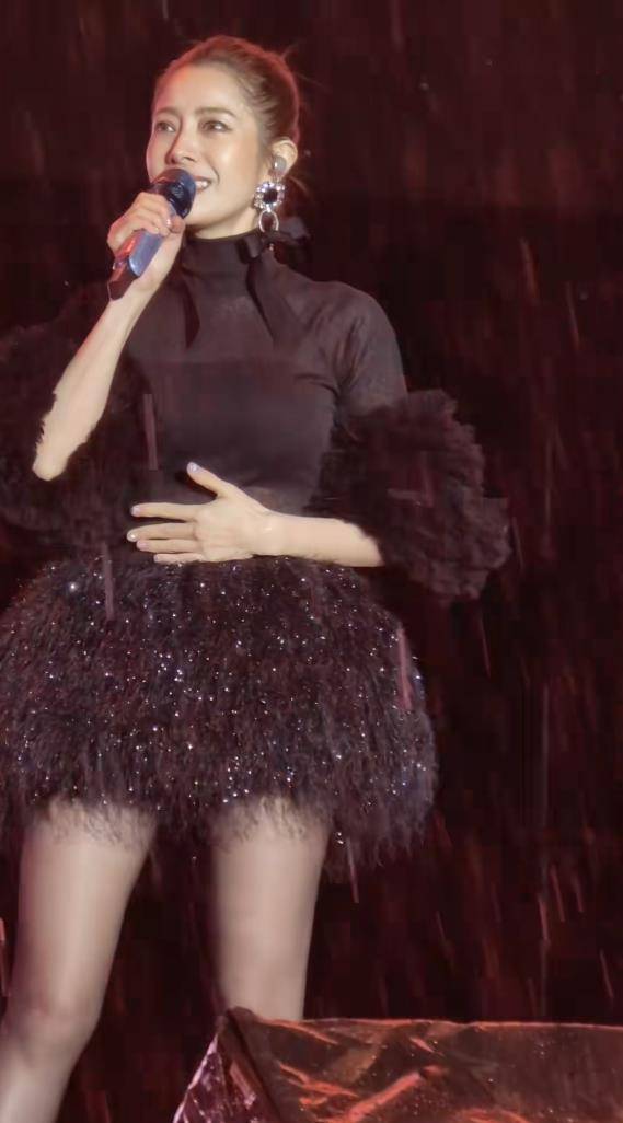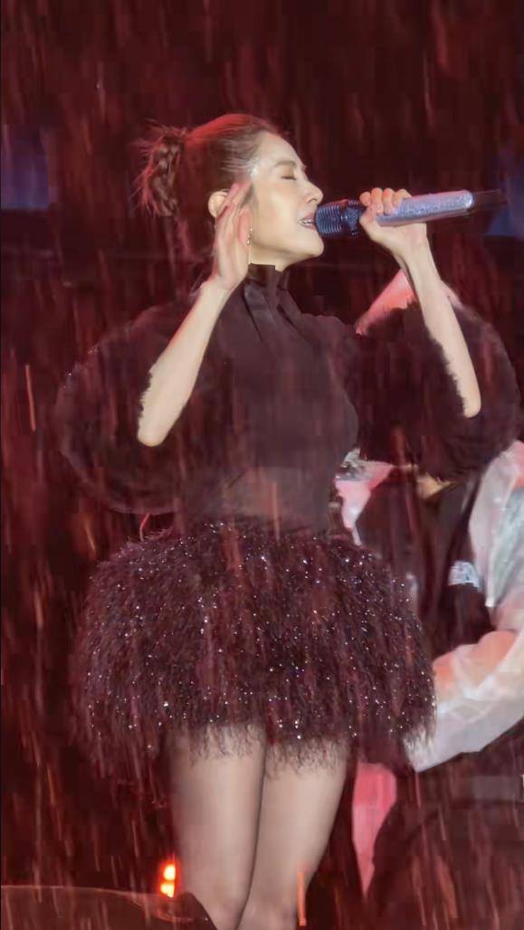 从现场曝光的画面看,徐怀钰状态堪称“元气满满”。黑色毛绒短裙造型,被雨水打湿后更添几分真实与力量感,湿发与交织的灯光营造出震撼又感人的舞台效果。