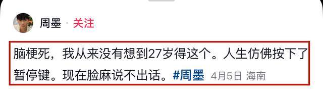 4月初,27岁演员周墨突然更新视频账号,原以为是复出,没想到官宣噩耗,据其透露,他不幸患上了脑梗死,目前状况堪忧,除了不能正常说话之外,日常行走也非常困难,即便是在家,也需要靠轮椅。