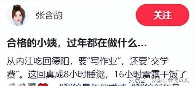 1. **胖三公斤也能上热搜?** , 张含韵年夜饭吃成连续剧,网友:这不就是慢炖的艺术吗?,2. **吃瓜群众:我从未想过** , 被称为“最不受欢迎姐姐”的她,居然能靠慢功夫翻身,这身作为内娱界的“松弛感”独播。,3. **沙罐嗓出血还要继续?** , 张含韵每天绑着沙罐嗓练习《海棠花开》,这才是真正的努力,别说是“慢功夫”,是“苦功夫”。,4. **演唱会哭到破音,台下万人替她接拍子?** , 这个甜妹标签,终于碎成了亮片,网友:这不就是内娱界的“破防时刻”吗?,5. **打麻将吃美食,胖了不少?** , 张含韵的年夜饭,堪称一场“胖剧”现场,吃瓜群众:这才是真正的“剧情”啊。,6. **帮外甥女写作业?** , 又一波“乡村教师”打架,张含韵:我只是想教教外甥女写作业而已,没想当全民大姐大。,7. **三年前被投弃,现在靠努力翻身?** , 网友:这姐姐的苦功夫,真心不戳,慢炖三伏再加一波,彻底送给内娱!,8. **沙发上打麻将,桌上摆着一碗粥?** , 张含韵的年夜饭,吃瓜群众:这才是真正的“年味”,一碗粥一盘麻将,日子难得有味。,9. **从“最不受欢迎”到“甜妹标签”?** , 三年前被称为“最不受欢迎姐姐”,如今靠努力成为观众心中的“甜妹”,这不就是内娱剧本吗?,10. **努力人设?我倒觉得是怕砸场子!** , 张含韵的努力,吃瓜群众:这才是真正的“怕砸场子”啊,慢慢来,快快乐乐,才是真香的年味!1. "张含韵的努力真令人敬佩!从'最不受欢迎姐姐'到现在的状态,堪称逆袭之王。" ,2. "年夜饭变成连续剧,这也太有创意了吧!不过这也解释了她最近微博热搜的原因。" ,3. "沙罐嗓+温糖水,难怪能从'甜妹'破音到'甜妹标签',这才是努力的真谛。" ,4. "三公斤的差距,换成了全网的热议,原来努力可以这么有趣!" ,5. "从绕口令到海棠花,张含韵的综艺报价被顶上热搜,这波操作,真的太有才了。" ,6. "年夜饭连续剧,年夜饭大hotsearch,张含韵的努力也太让人心疼了吧!" ,7. "从'破音'到'接拍子',这才是真正的甜妹标签!努力人设加身了,原来努力也能这么治愈。" ,8. "三公斤的差距换来了全网的热议,原来努力可以这么有成就感!" ,9. "从'沙罐嗓'到'温糖水',张含韵的努力演变史,让人倍感震撼!" ,10. "年夜饭连续剧,年夜饭大hotsearch,张含韵的努力也太让人心疼了吧!"
