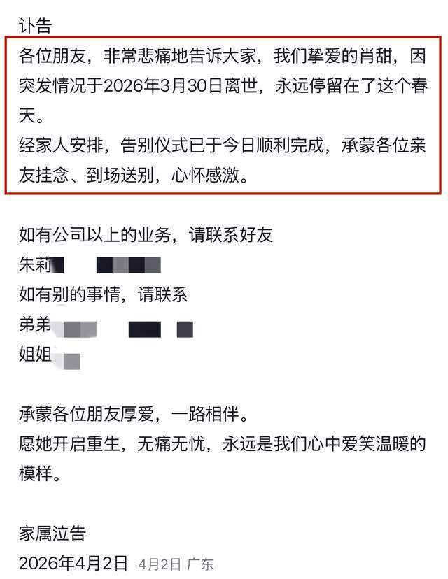 从公开的讣告中不难得知,去世的女孩名叫肖甜,来自江西,年仅35岁,从25岁开始一直在广东打拼,这些年虽然有成绩,但家庭以及其他方面都没来得及组建,可以说,除了同事以及一个姐姐一个弟弟,她孑然一身。
