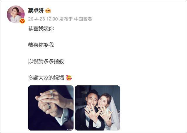 4月28日中午,蔡卓妍发布微博宣布结婚,称:“恭喜我嫁你,恭喜你娶我,以后请多多指教,多谢大家的祝福。”