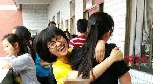 课余时间,同学们都会站到教室外的走廊上放松放松,沈月和同学玩闹的样子,可以看出她的性格很活波了,戴着眼镜,笑成表情包的她,就像小黄人一样可爱。