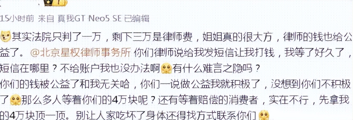 声称这笔款项里三万都是律师费,真正的名誉赔偿金仅有一万元而已。